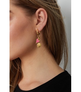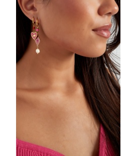 Goudkleurige oorhangers met een roze harten bedels. De lengte van deze oorbel is circa 4.3 cm. Voor oren met gaatjes. De oorbellen zijn nikkelvrij.