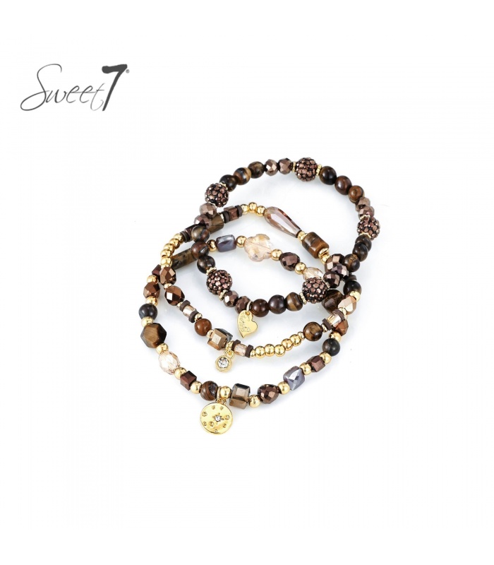 De combinatie van bruintinten, goudkleurige kralen en fonkelende accenten geeft deze armbanden een stijlvolle en veelzijdige uitstraling. De glans van de facetkralen vangt het licht op een subtiele manier, waardoor je pols altijd opvalt.