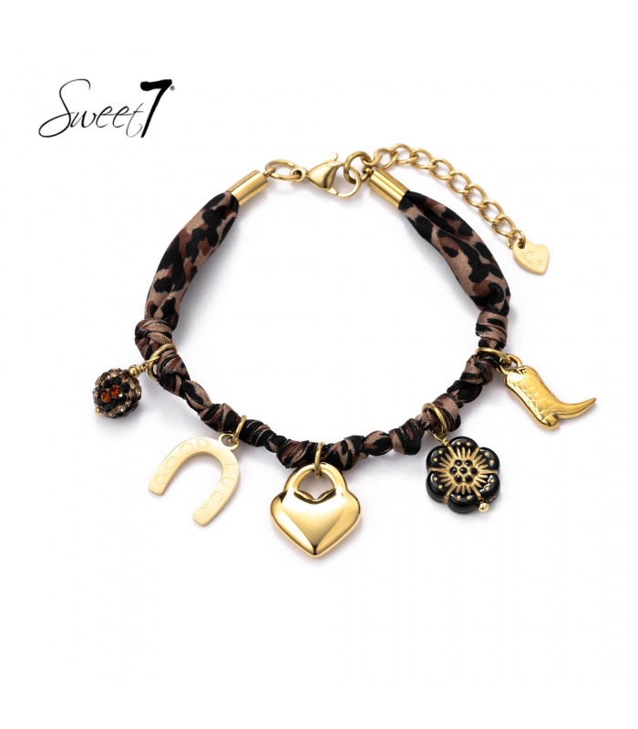 Wat maakt deze armband zo bijzonder? De combinatie van dieren print stof met gouden bedels vol betekenis. Van hart tot hoefijzer, elk symbool voegt karakter toe. De satijnen band zorgt voor een comfortabele luxe.
