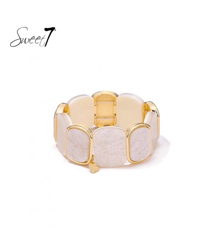 Zoek je een accessoire dat zowel elegant als moeiteloos aanvoelt? Deze armband van Sweet7 combineert zachte crème tinten met een gouden omlijsting voor een look die doet denken aan zonlicht op zandsteen. De subtiele glans en de gladde afwerking maken het een stijlvolle keuze voor elke gelegenheid, van brunch tot avondje uit.