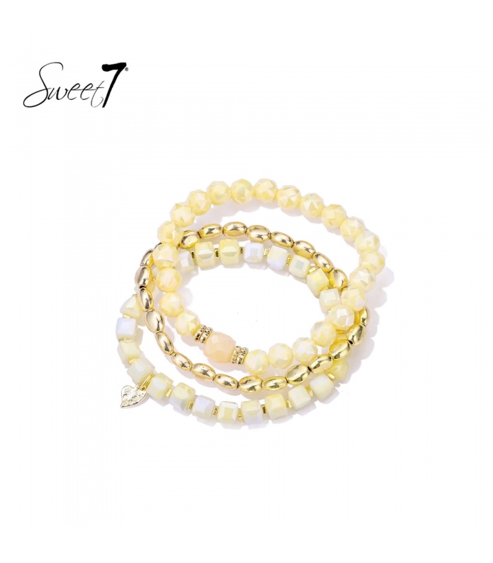 Kan een armband meteen een zonnige, trendy look geven? Deze armband set met gele kralen doet precies dat. De zachte gele tinten en glanzende kralen geven deze kralen armband een frisse fashion uitstraling. De goudkleurige details zorgen voor een warme, stijlvolle finishing touch.