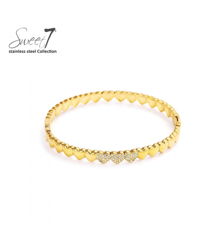 Mag jouw pols wat extra liefde uitstralen? Deze goudkleurige bangle bestaat volledig uit kleine hartjes, met centraal drie fonkelende hartjes vol zirkonia steentjes. De combinatie van roestvrij staal en glans geeft het ontwerp een luxueuze en romantische feel.