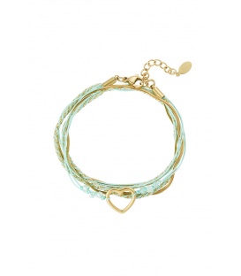 Groene armband met een goudkleurige harten bedel en kralen. De lengte van de armband is 32 cm en 3 cm verlengkettinkje. De armbanden zijn nikkelvrij.