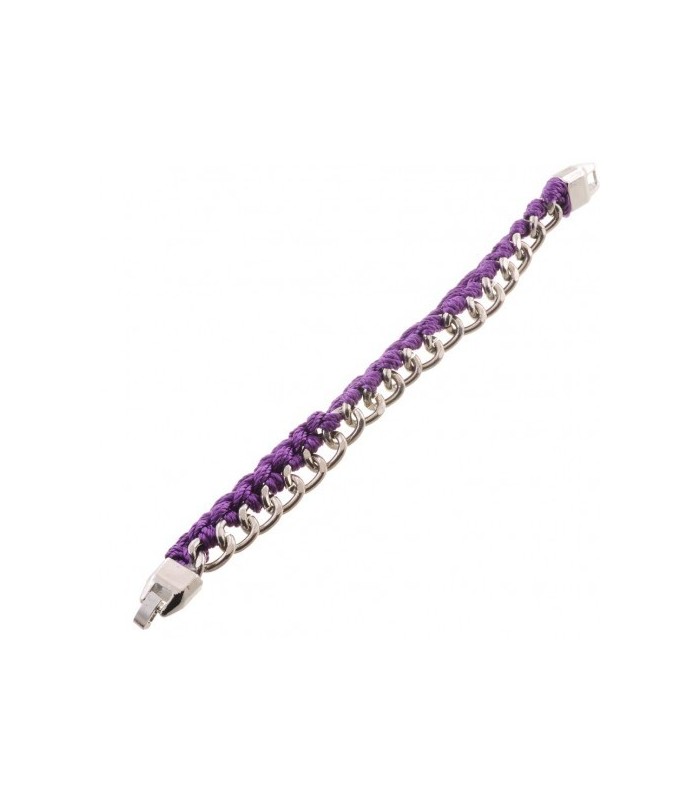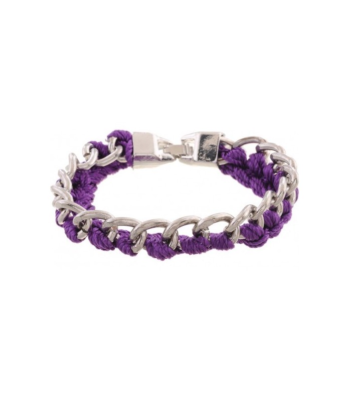 Metalen schakelarmband met paars koord. Lengte van de armband is 18,5 cm.