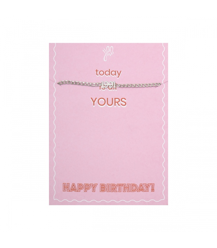Zilverkleurige armband met geboortejaar 1991 en verjaardagskaart.
