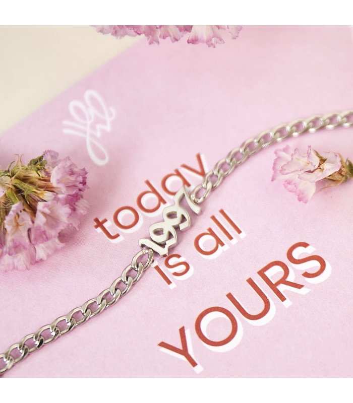 Zilverkleurige armband met geboortejaar 1998 en verjaardagskaart.