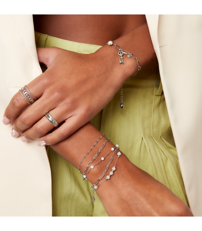 Op zoek naar een prachtige armband die je outfit compleet maakt? Bekijk dan onze zilverkleurige schakel armband met 3 lagen en glas kralen van Yehwang. Deze unieke armband heeft een opvallende en stijlvolle uitstraling en is perfect om te dragen bij verschillende gelegenheden.