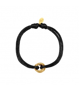 Zwarte armband met satijnen koord en zilverkleurige bedel. De lengte van de armband is 16 cm. De armband is nikkelvrij.