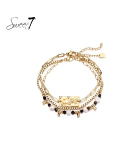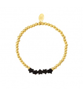 Zwart met goudkleurige armbanden met kralen en bedels. De lengte van de armband is circa 17.5 cm. De armband is nikkelvrij. De armband is voor zien van een verlengketting van 3 cm.