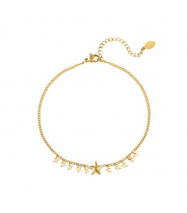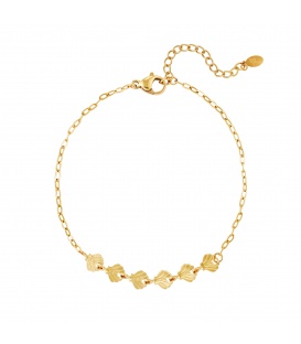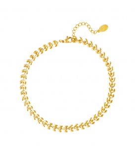 Goudkleurig enkelbandje met bladeren. Het enkelbandje heeft een lengte van 22 cm. Nikkelvrij. Voorzien van een verlengketting van 3 cm