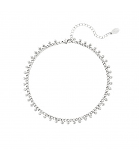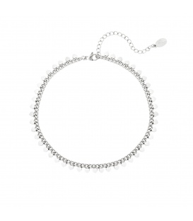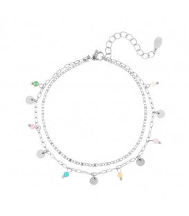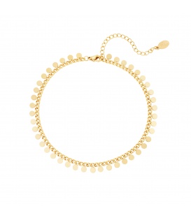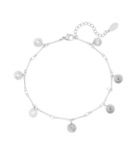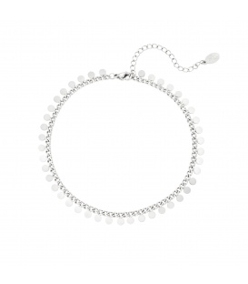 Zilvergekleurde enkelband met cirkeltjes. Het enkelbandje heeft een lengte van 22 cm. Het enkelbandje is nikkelvrij. Het enkelbandje heeft een lobster sluiting. Het enkelbandje is voorzien van een verlengketting van 5 cm