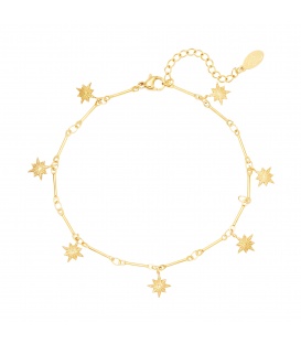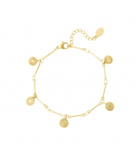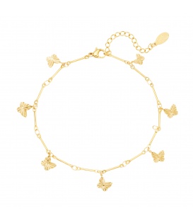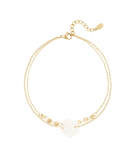 Goudkleurig enkelbandje met een bloem bedeltje. Het enkelbandje heeft een lengte van 22 cm. Nikkelvrij. Voorzien van een verlengketting van 3 cm.