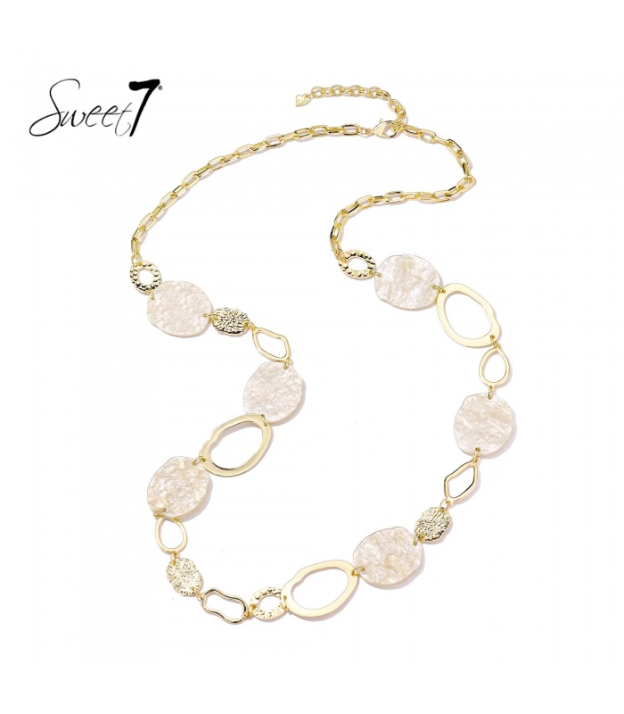 Hoe draag je verfijning en trendgevoel in één sieraad? Deze halsketting van Sweet7 bewijst dat het kan. De zachte, beige schijven zorgen voor een rustige en chique basis, terwijl de goudkleurige open vormen en gestructureerde details zorgen voor een eigentijdse twist. Tijdloos, maar met een trendy uitstraling.