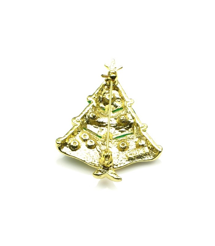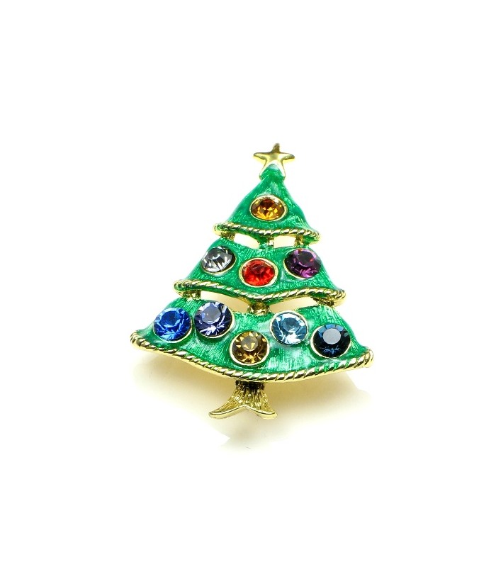 Broche (kerstboom) met gekleurde strass in goudkleurige zetting