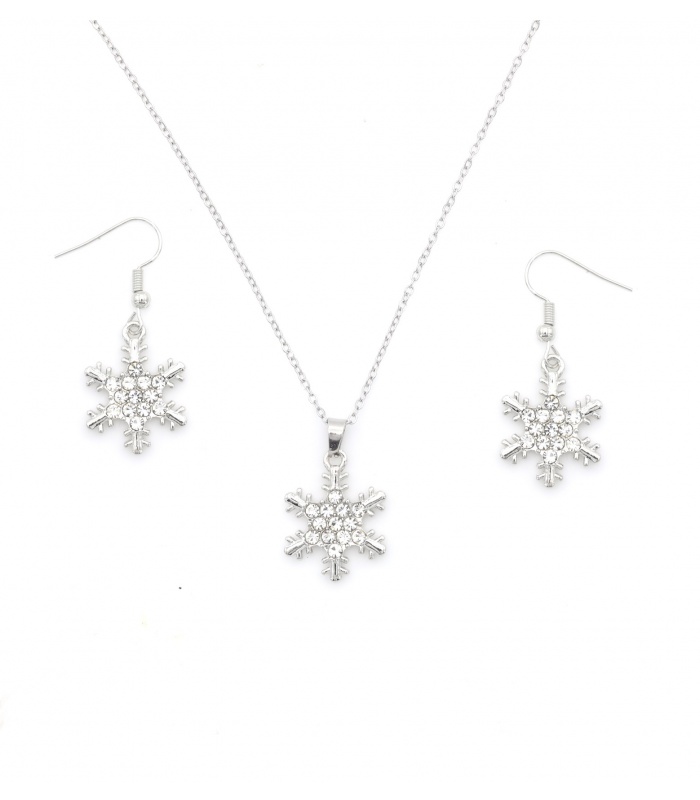 Zoek je een set die jouw feestlook compleet maakt? Deze halsketting met bijpassende oorbellen in sneeuwvlokvorm is een echte eyecatcher. De zilverkleurige afwerking en sprankelende strass steentjes zorgen voor een winterse sparkle bij elke outfit. Ideaal voor kerst of een winterfeest.