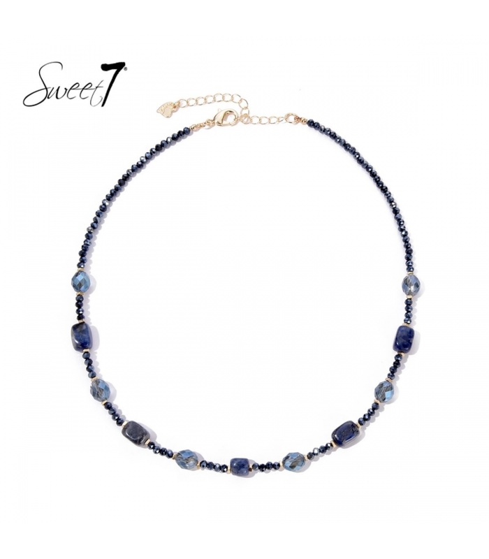 Hoe geef je je outfit een verfijnde touch zonder te overdrijven? Deze blauwe halsketting met facetgeslepen kralen en diepblauwe steentjes doet precies dat. De glans van de kralen vangt het licht, wat zorgt voor een elegante effect bij elke beweging.