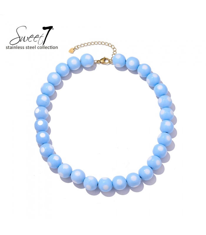 Waarom kiezen tussen speels en stijlvol als je beide kunt hebben? Deze halsketting uit de Sweet7 is de kleur boost die je look doet opleven. De grote, glanzende kralen in helder babyblauw brengen direct frisheid en flair. Een eyecatcher die doet denken aan zomerhemels perfect voor wie durft te stralen met kleur.