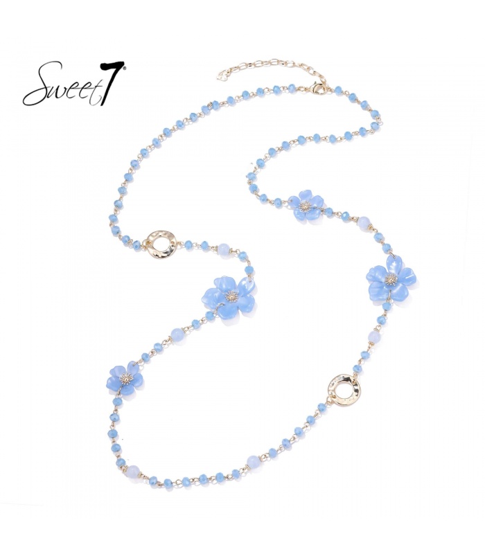 De heldere lichtblauwe tinten en bloemenaccenten doen denken aan een strakblauwe lucht vol bloesem. Deze halsketting straalt lichtheid en vreugde uit, perfect voor wie haar outfit een zachte kleur boost wil geven. De glanzende kralen en fijne bloemdetails geven een elegante, speelse touch. Een modieus sieraad dat je look meteen opfrist.