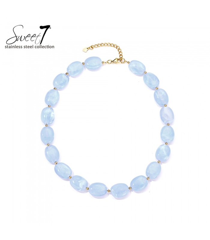 Deze halsketting met glanzende lichtblauwe kralen straalt rust en stijl uit. De subtiele goudkleurige accenten zorgen voor een harmonieuze afwerking die moeiteloos past bij zowel casual als geklede looks.