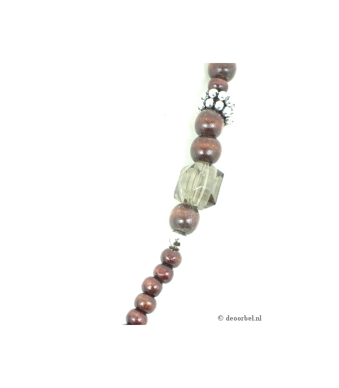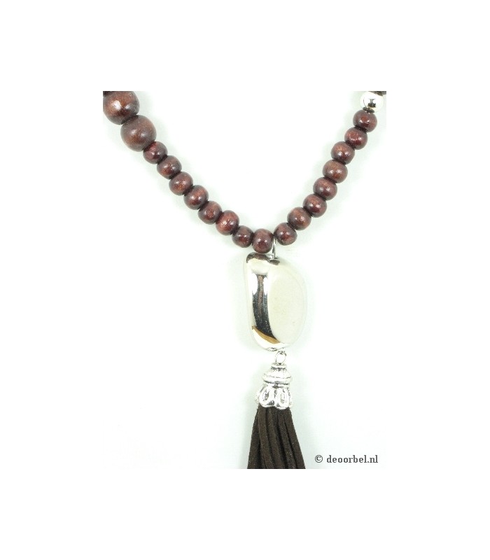 Bruine houten kralenhalsketting met suede hanger. Lengte van de halsketting is 80 ᅠcm. De lengte van de hanger is 16 cm.