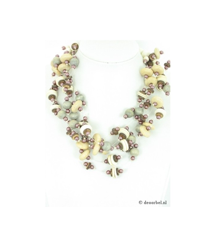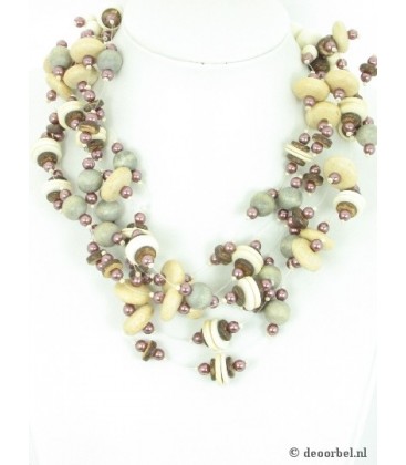 kralenhalsketting met bruine, grijze en witte deels houtenkralen