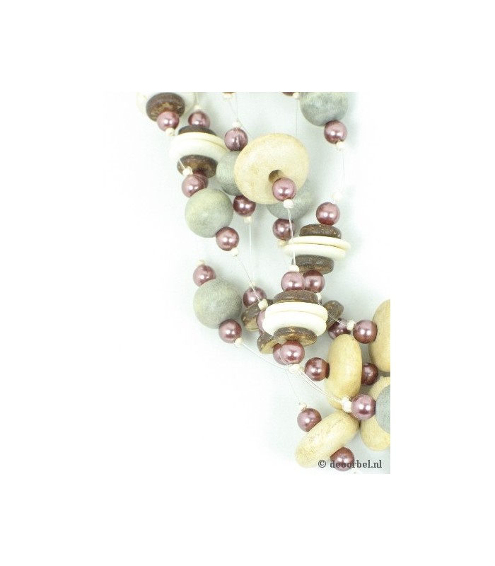 kralenhalsketting met bruine, grijze en witte deels houten kralen. Lengte van de halsketting is ᅠ42 cm met een verlengkettinkje van ᅠ7 cm.