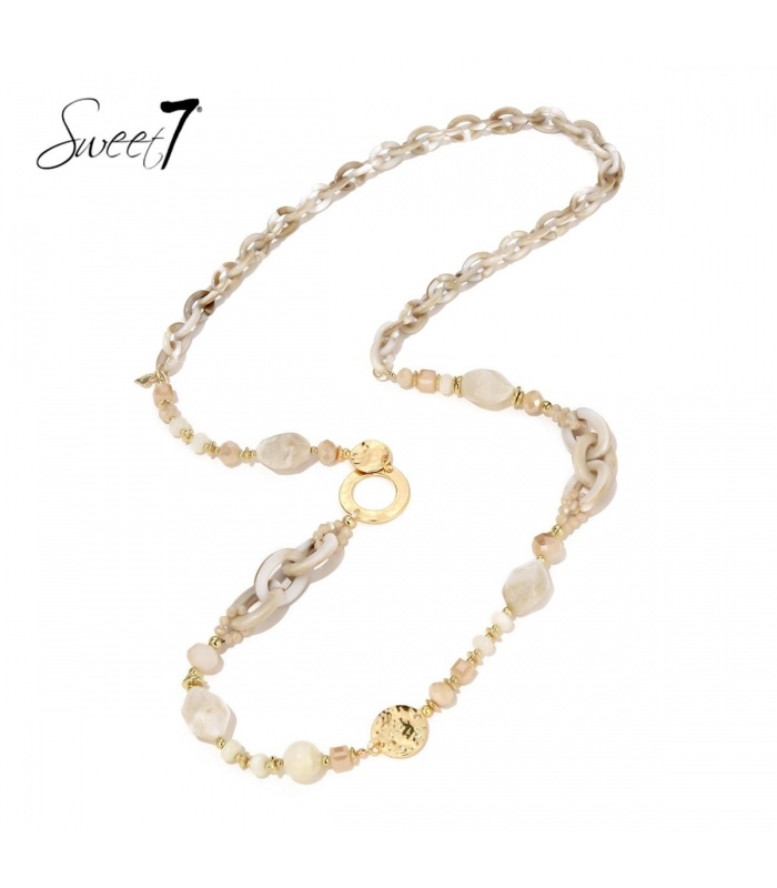 Beige en goud vormen samen een klassieke combinatie die moeiteloos te integreren is in diverse stijlen. Deze ketting voegt een vleugje glamour toe zonder te overheersen. Een must-have accessoire voor elke sieradenliefhebber.