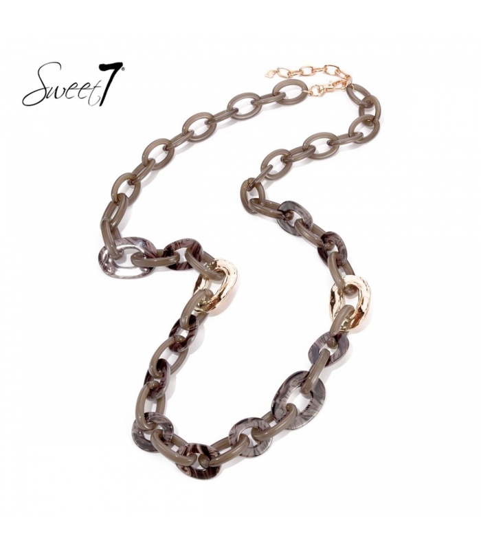 Op zoek naar een eyecatcher die moeiteloos met elke outfit matcht? Deze camel kleurige halsketting van Sweet7 combineert matte schakels met glanzende goudkleurige details voor een speels maar stijlvol effect. De kunststof schakels geven een moderne twist aan elke basic top of jurk. Deze fashion ketting is de perfecte mix van casual en chic.
