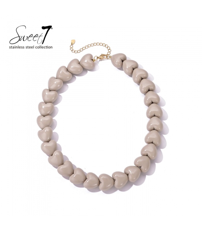 Zoek je een halsketting die liefde en fashion combineert? Deze halsketting met beige hartjes straalt zachtheid uit. De glanzende vormen geven een speelse touch. Perfect als statement ketting bij een basic top of jurk.