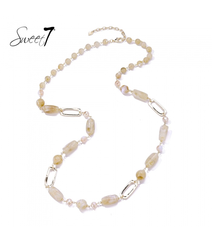 Zoek je een sieraad dat rust en elegantie uitstraalt? Deze halsketting vormt een harmonieus geheel van zachte beige tinten en goudkleurige accenten. De onregelmatige kralen hebben een marmerachtig patroon dat elke beweging een vleugje zachtheid meegeeft, alsof je een stukje natuur draagt.