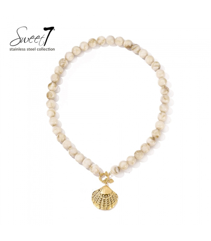 Is deze halsketting geschikt voor een warme en natuurlijke stijl? Ja, deze halsketting met beige kralen en een goudkleurige schelp hanger geeft een rustige en zomerse uitstraling die direct opvalt. Deze halsketting past binnen de trend van kralen ketting en zomerse sieraden. De kralen zorgen voor een speels effect, terwijl de schelp hanger een verfijnde touch toevoegt. Mooi bij zowel luchtige als nette outfits.