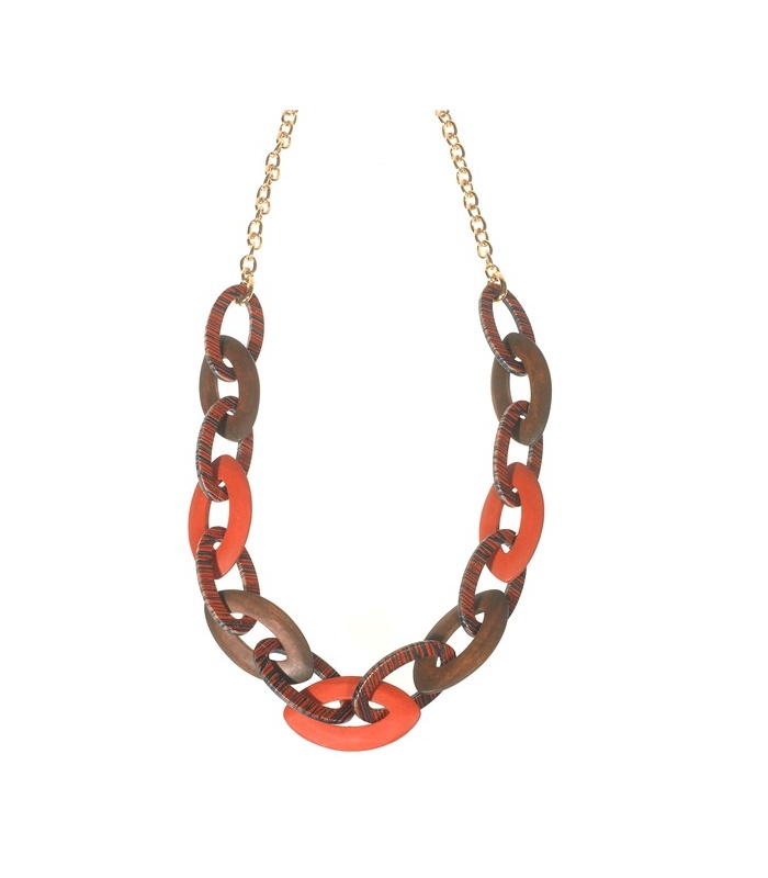 Lange halsketting met grote houten schakels en goudkleurige Jasseron