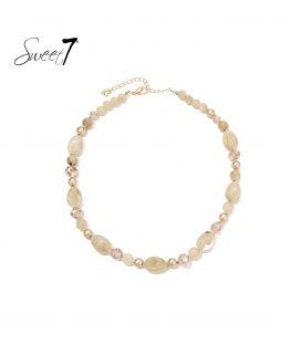 Beige korte halsketting met goudkleurige kralen. Deze beige korte halsketting met goudkleurige kralen combineert subtiele eenvoud met een vleugje luxe. De neutrale beige tinten maken deze ketting veelzijdig en perfect te combineren met verschillende stijlen en kleuren. De goudkleurige kralen voegen een elegante glans toe.