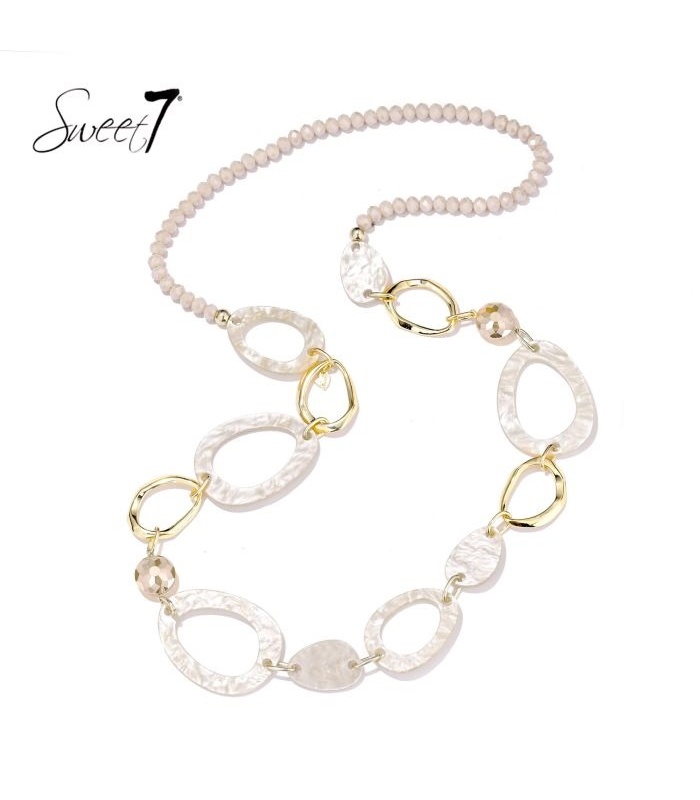 Hoe straal je elegantie uit zonder te overdrijven? Deze lange halsketting van Sweet7 bewijst dat absoluut. De zachte, beige schakels in organische vormen worden afgewisseld met subtiele goudkleurige accenten en neutrale facetkralen. Het resultaat is een verfijnde ketting die licht en beweging toevoegt aan elke look, zonder te overheersen.