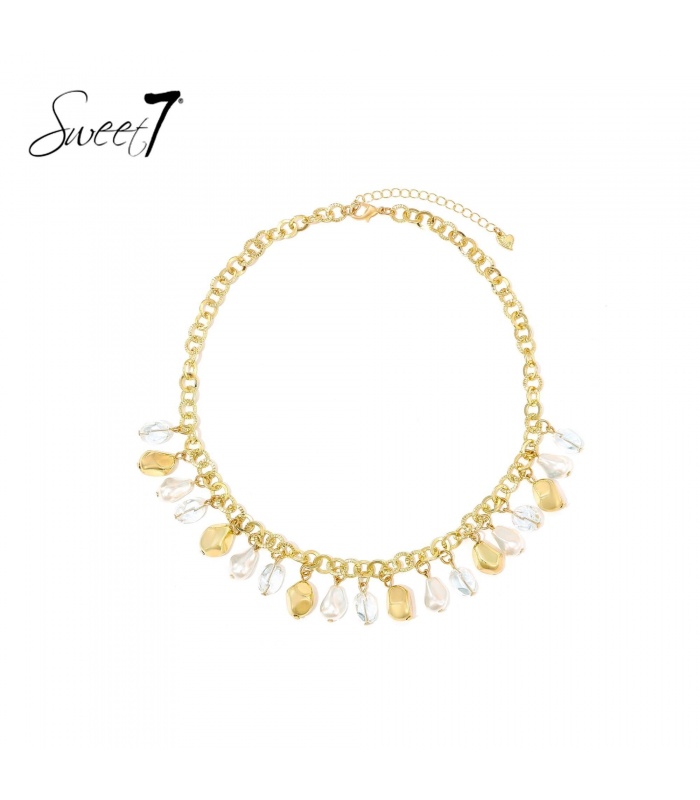 Op zoek naar een halsketting die elke outfit net dat beetje extra geeft? Deze ketting combineert een stevige goudkleurige schakel met transparante en parelachtige hangers. Het contrast tussen structuur en glans zorgt voor een moderne en stijlvolle twist.