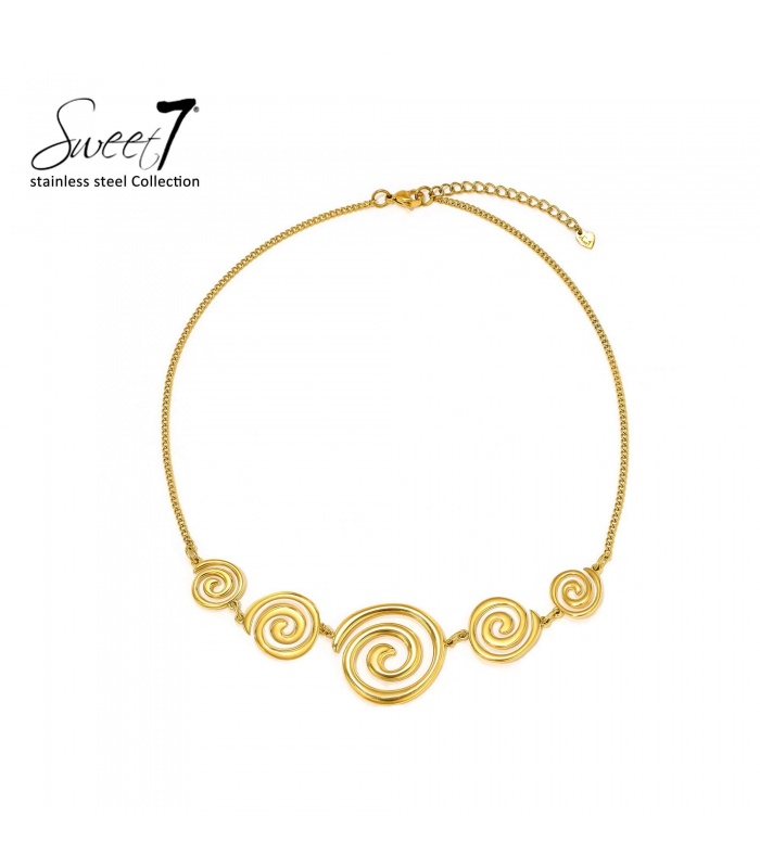Zoek je een halsketting die opvalt zonder te overdrijven? Deze goudkleurige ketting met spiraalvormige elementen trekt meteen de aandacht. De vloeiende lijnen geven een moderne en speelse touch aan je halslijn, ideaal voor wie houdt van eigentijdse elegantie.