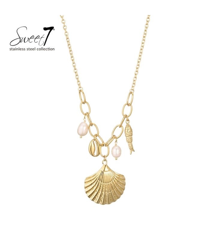 Wil je een halsketting die je outfit direct een frisse look geeft? Deze halsketting met schelp hanger, parels en goudkleurige bedels straalt zomers uit. Perfect als trendy ketting of dames ketting voor een lichte, moderne stijl.