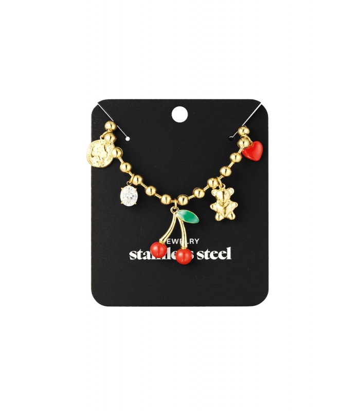 Halsketting met meerdere bedels. Deze goudkleurige ketting straalt elegantie uit en is voorzien van verschillende bedels die speelse details toevoegen. Draag hem solo voor een subtiele touch of combineer met andere kettingen voor een trendy look. Een veelzijdig sieraad dat zowel bij casual als feestelijke outfits past.