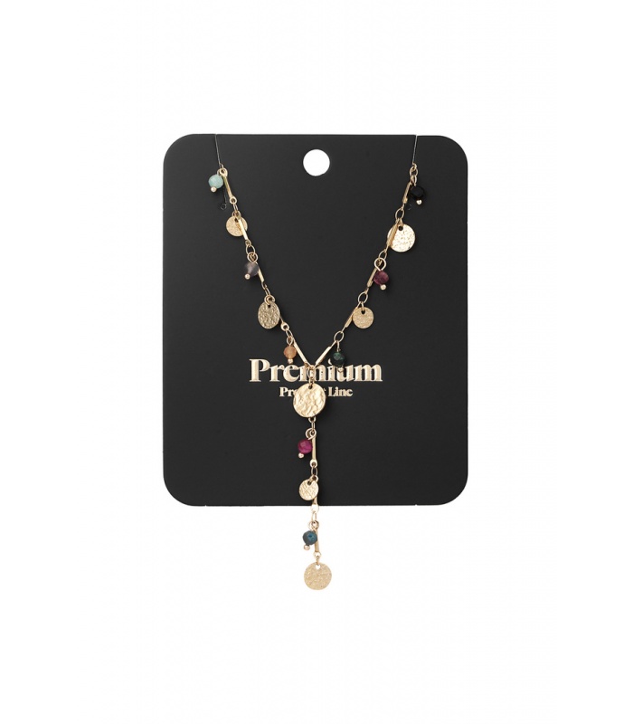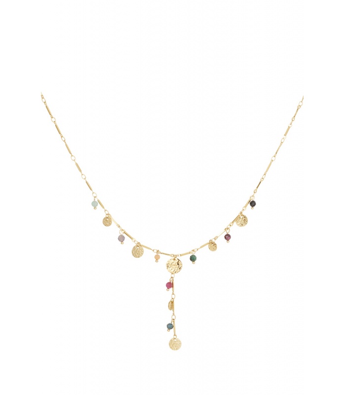 Deze goudkleurige halsketting met bedels en kralen is de perfecte combinatie van stijl. De ketting heeft een mix van delicate bedels en kleurrijke kralen die subtiel glinsteren, wat zorgt voor een levendige, bohemian look. Draag hem solo voor een minimalistische look of combineer met andere kettingen voor een trendy laagjes-effect. Deze ketting is een mooie aanwinst voor elke sieradencollectie.
