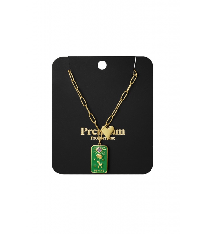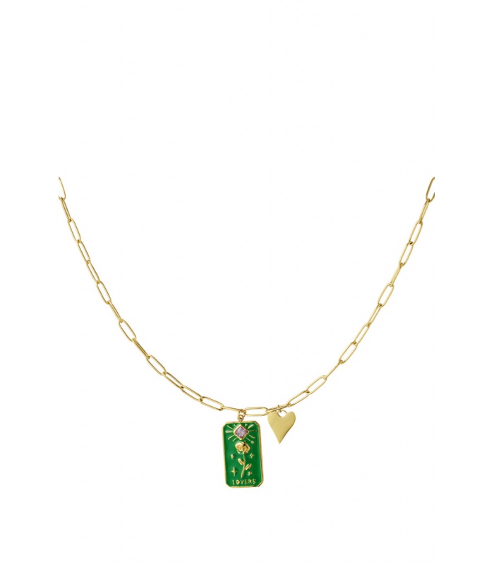 Geef je outfit een romantische, goudkleurige halsketting, voorzien van een groene bedel en een verfijnd hartje. Het groene van de bedel zorgt voor een opvallend contrast met de gouden ketting, wat dit sieraad een elegante en unieke uitstraling geeft. Het subtiele hartje maakt deze ketting extra bijzonder.