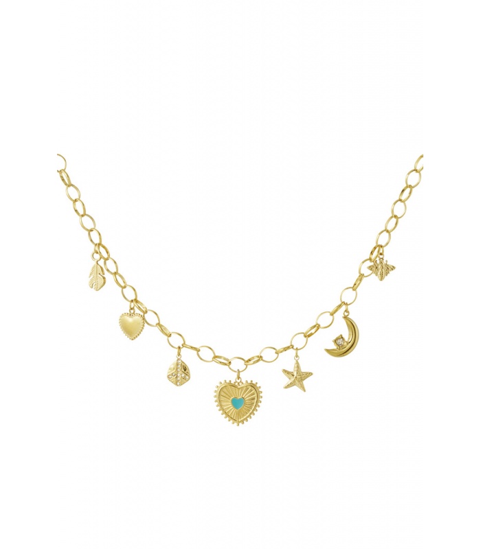 Deze opvallende halsketting is het perfecte statement piece dat elke outfit naar een hoger niveau tilt. Of je nu een avondje uit gaat of je dagelijkse look wilt opfrissen, deze ketting voegt instant glamour toe aan elke gelegenheid. De combinatie van de goudkleurige ketting met de diverse hangers zorgt voor een veelzijdig stuk dat moeiteloos kan worden gestyled.