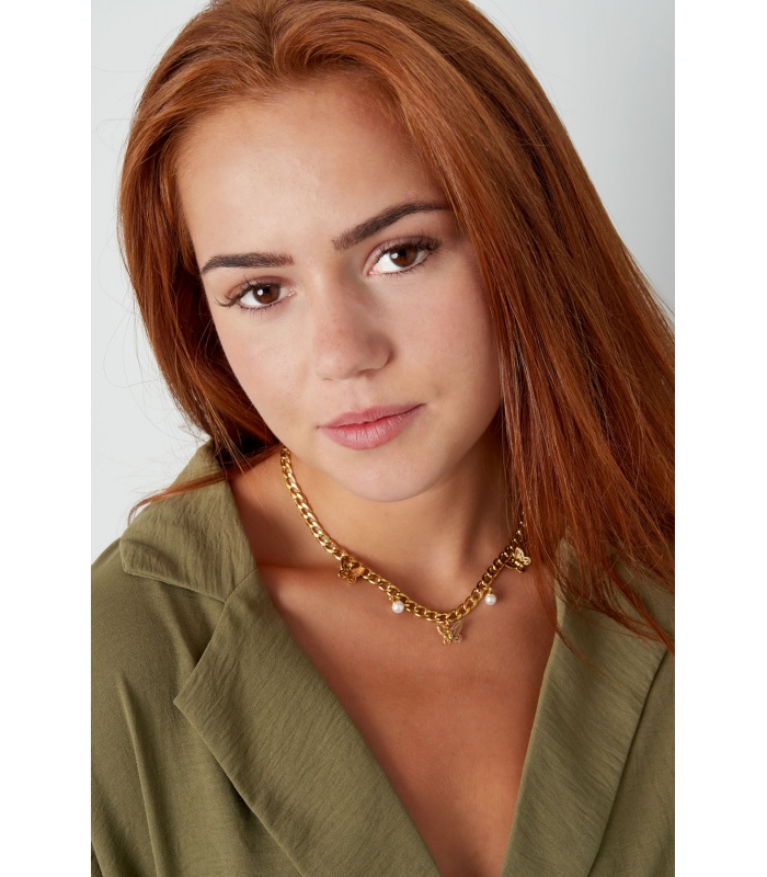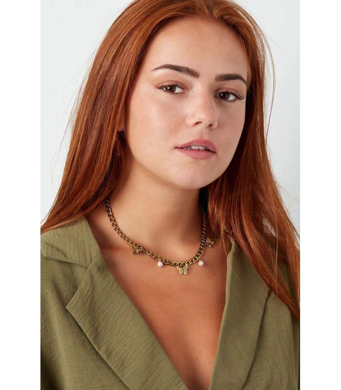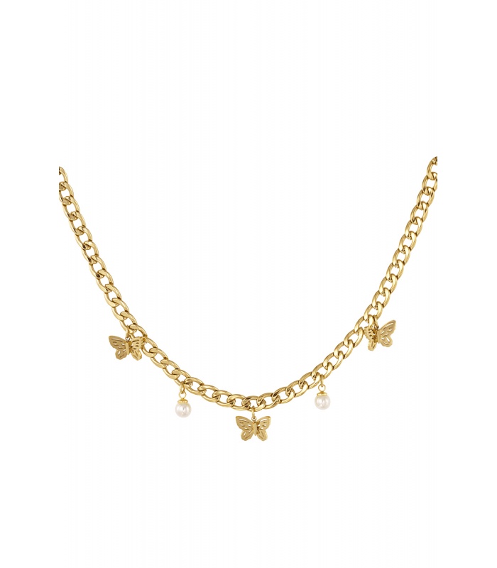 Goudkleurige halsketting met vlinders en pareltjes.