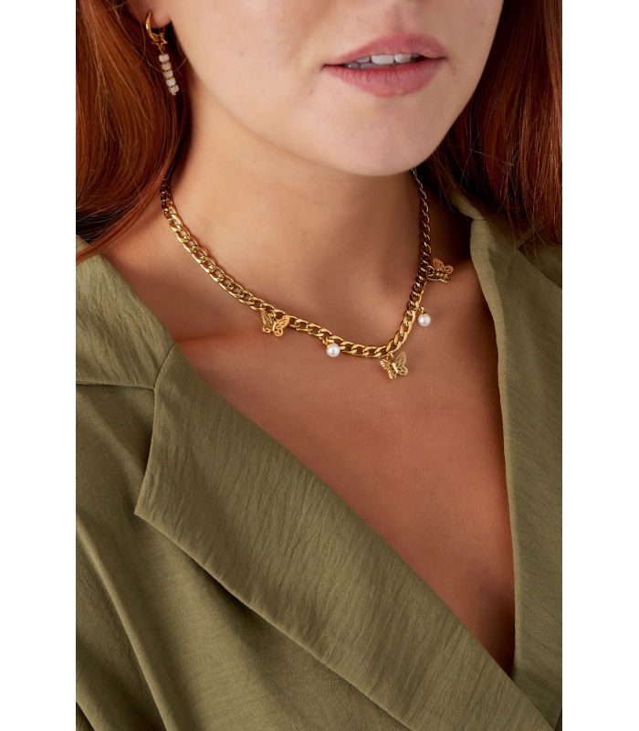 Betoverende details: De vlinders en pareltjes op deze goudkleurige halsketting zorgen voor een betoverend effect. Ze voegen een speelse en elegante touch toe aan je look.