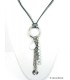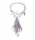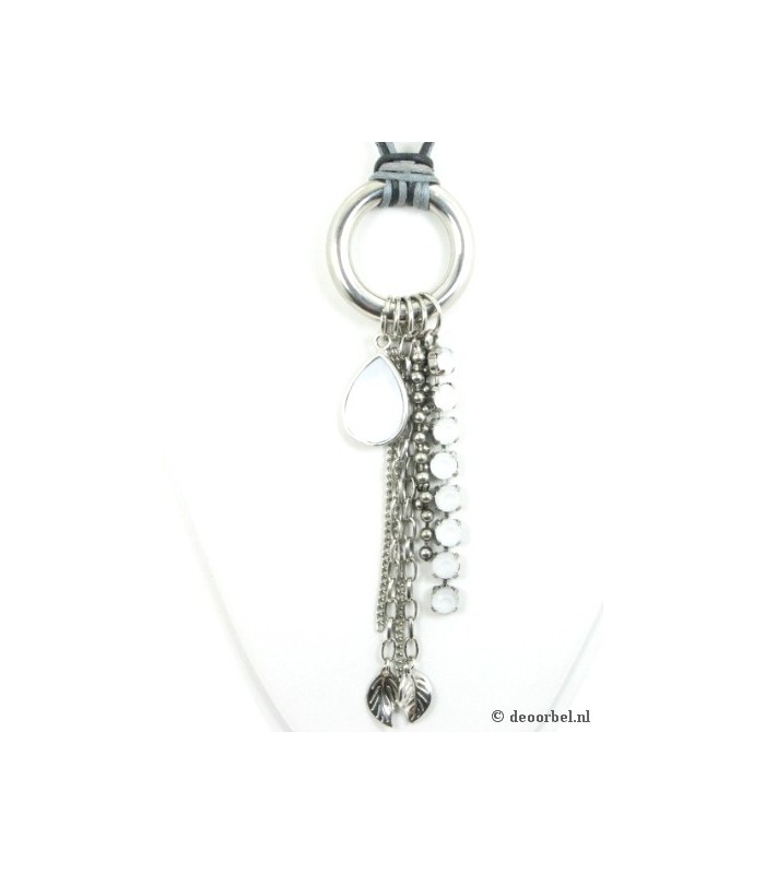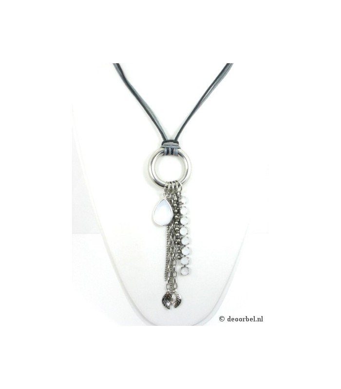 Grijze koord ketting met metalen bedels en acryl kralen. Lengte van de halsketting is ᅠ80 cm met een verlengkettinkje van ᅠ7 cm. ᅠ Lengte van de hanger is 11 cm.