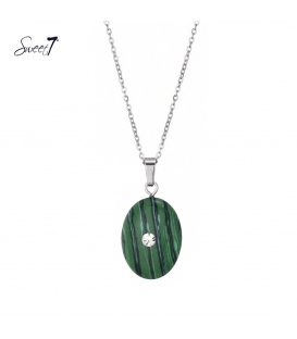 Zilverkleurig korte ketting met ronde hanger van synthetisch malachiet