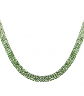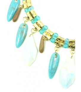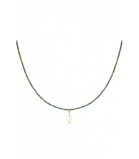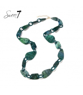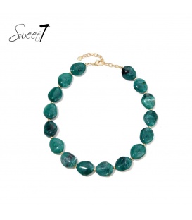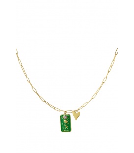 Groene korte schakel halsketting met goudkleurige elementen. De lengte van de halsketting is circ45 a 50 cm. De ketting heeft een verlengkettinkje van 5 cm.