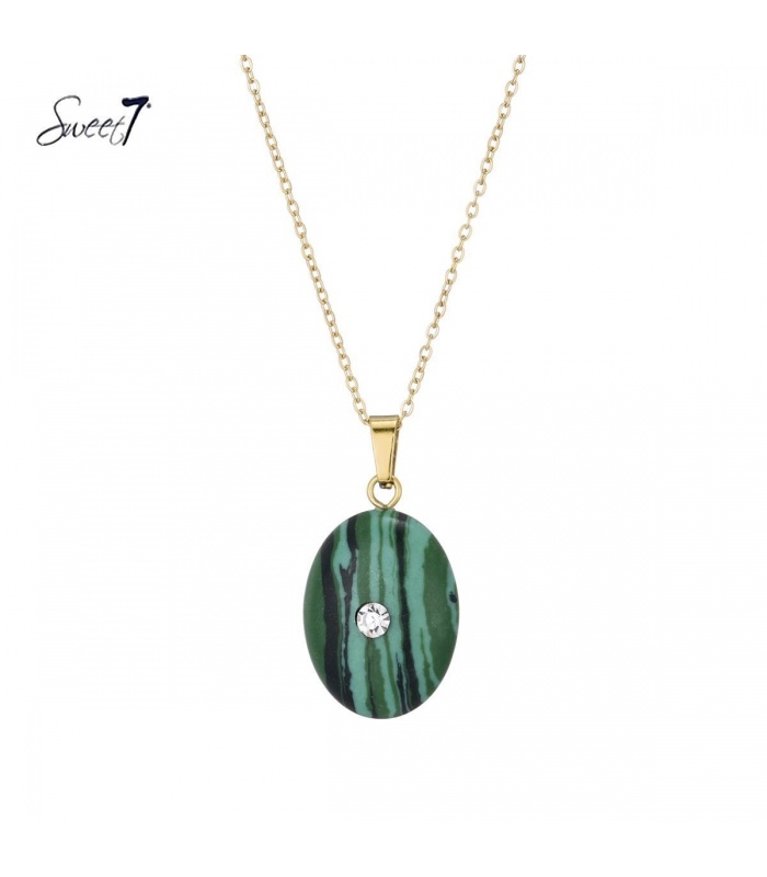 Goudkleurig korte ketting met ronde hanger van synthetisch malachiet.