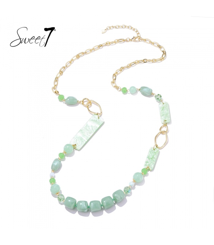 Ben je klaar voor een frisse blikvanger in je sieradencollectie? Deze halsketting van Sweet7 mixt trendy groentinten met goudkleurige schakels en unieke vormen. De combinatie van rechthoekige marmerlook elementen, speelse kralen en opengewerkte metalen details zorgt voor een moderne, natuurlijke uitstraling. Stijlvol én origineel.
