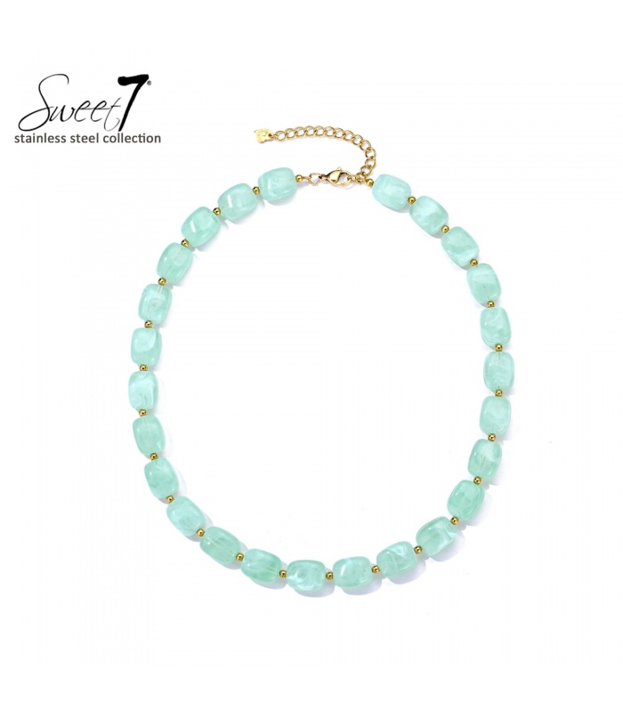 Hoe creëer je moeiteloos een frisse, verzorgde look? Deze halsketting in zachte mintgroene tint brengt direct licht en helderheid naar je outfit. De afgeronde kralen zijn subtiel gemarmerd en worden stijlvol onderbroken door goudkleurige accenten.