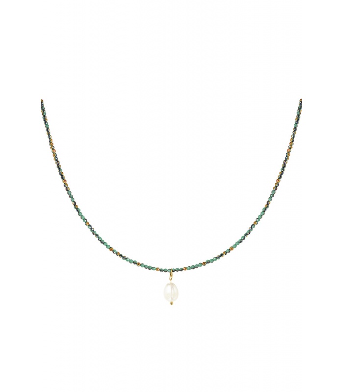 Deze verfijnde donkergroene ketting, gemaakt van glanzende glaskralen en voorzien van een prachtige parel, straalt een unieke combinatie van luxe en natuurlijke elegantie uit. De diepe groene kleur van de kralen biedt een stijlvolle, tijdloze look die perfect past bij zowel casual outfits als formele gelegenheden.